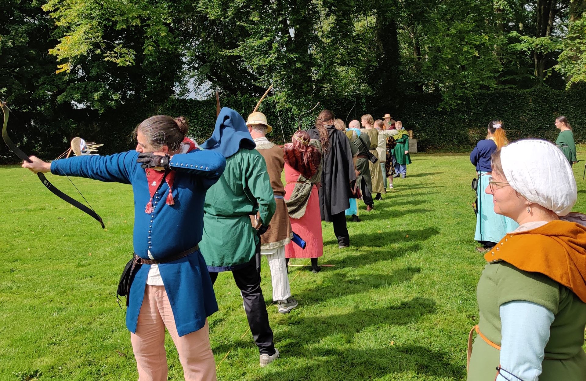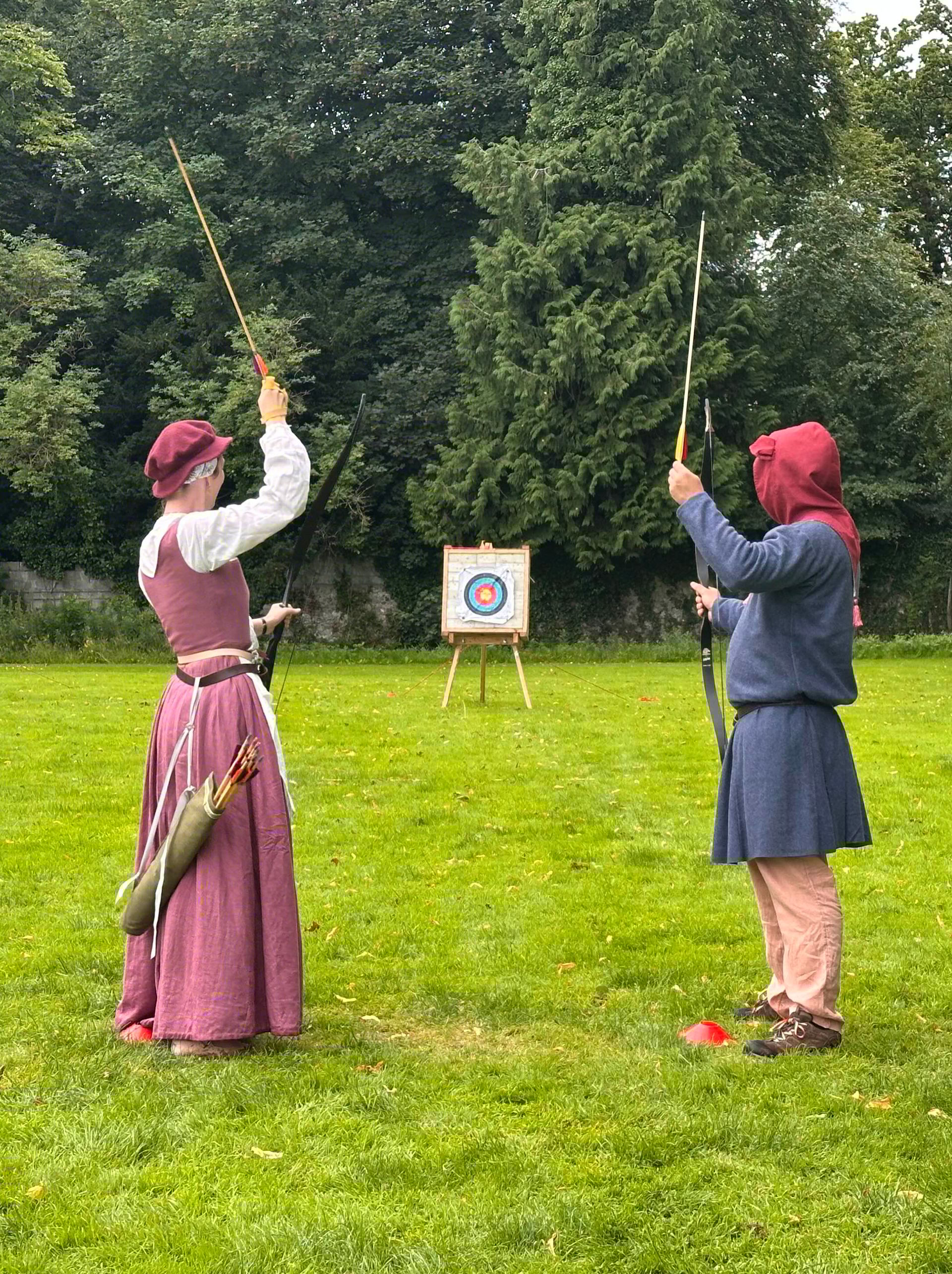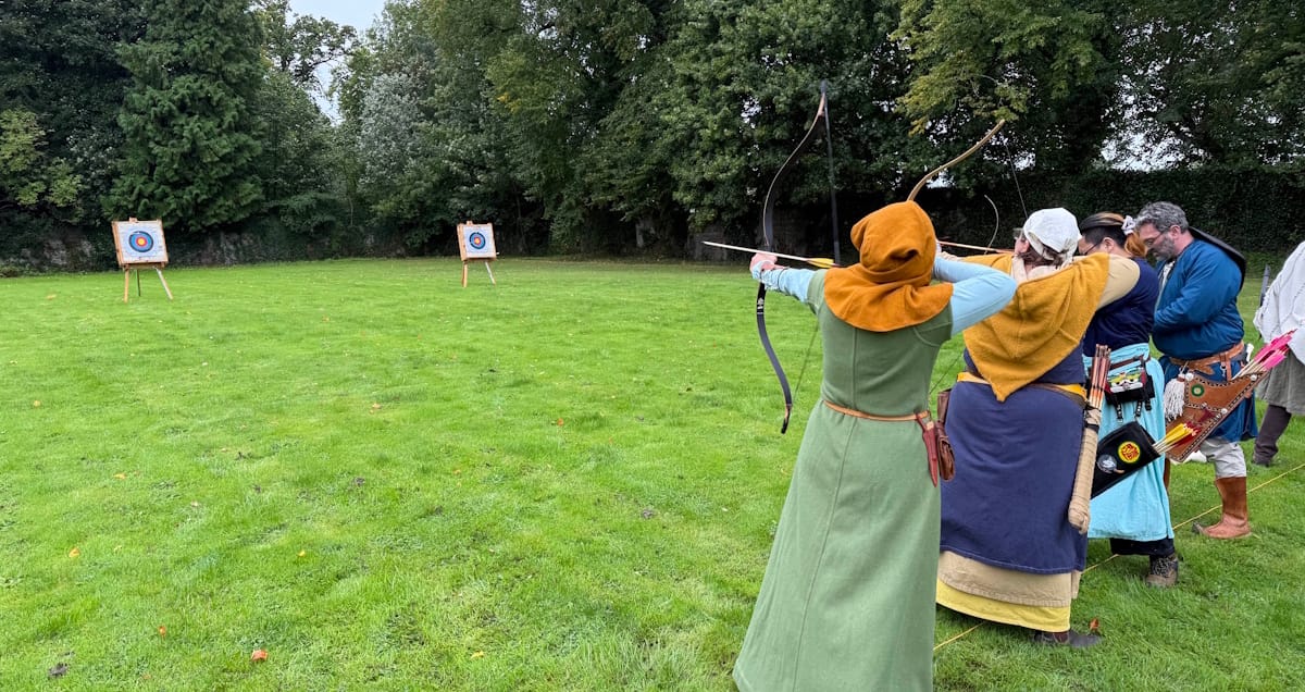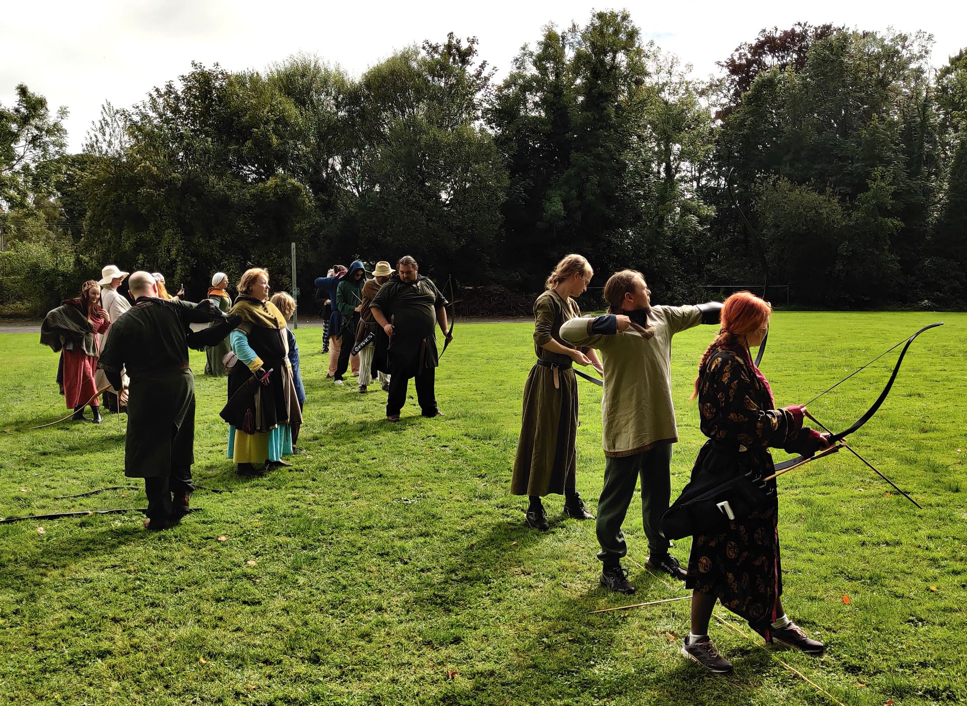 On the 30th of August, which already seems a lifetime ago, many of our members throughout the land gathered in Clara to string their bows, aim their arrows, shoot at their quarry (not ducks), and eat the wonderful food provided by our cooks (mostly not duck). Our Marshal in Charge Lady Gabriella della Luna provided guidance and wisdom, helped by THL Alays de Lunel, Noble Ingemar and Baron Robert in keeping the scores tracked, the time checked and the ducks in a row. The first challenge which had the participants quacking in their boots was the Portsmouth (10 rounds of 6 arrows) on a stationary target at 20 yards (which is definitely within duck egg throwing distance given that the current record is set at 71 meters, held by two Irishmen at the Irish National Open, though that was for hen’s eggs, admittedly).
