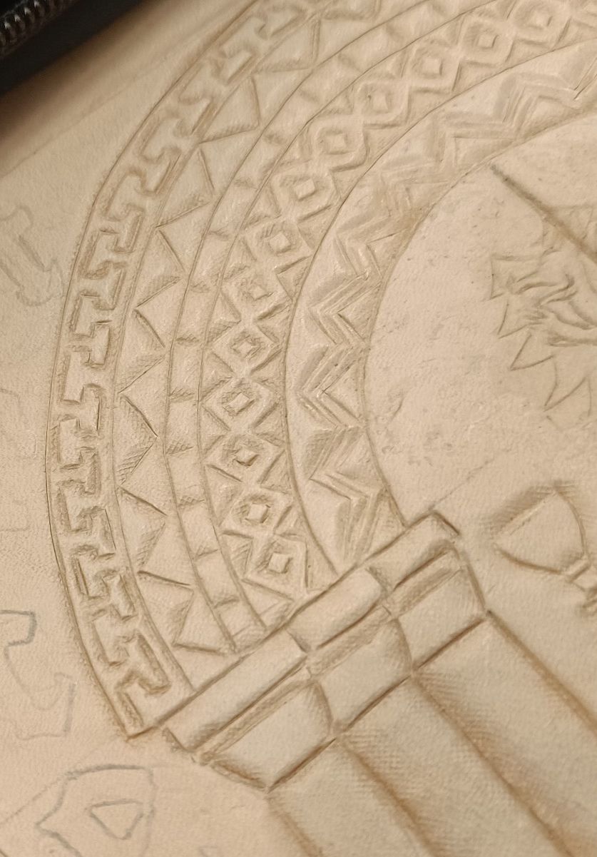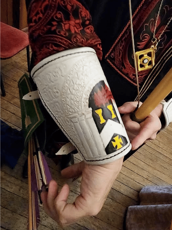 As many of you are already aware, Drachenwald gained a new member of the Order of the Mark at this year’s Autumn Crown over on the Big Island. This joyous occasion of course also called for the creation of the regalia, a pair of white bracers. The honour befell one of our own, Lady Erin Volya who is often seen making or carrying leather items of her own making. She produced a wonderful pair of bracers: