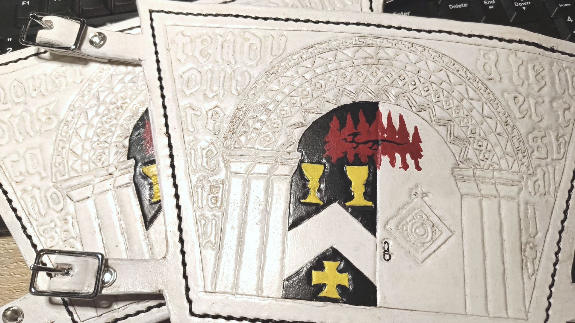 In the words of the creator: These braces are each carved from single pieces of leather including their straps, then glued to dyed white calfskin on the inside for comfort. The carving was inspired by the Anglo-Norman architecture of Llandaff Cathedral in Wales, in honour of Master Yannick's persona, with his heraldry and the symbol of the Order on the doors; with his noble heart and kind nature does he open the door to all comers to the Known World old and new. White acrylic was layered through countless applications of water-thinned paint. Weathering was done with dark brown antique that washed the colour into cream. As a personal touch, the Drachenwald heraldry features a more serpentine, East Asian dragon.