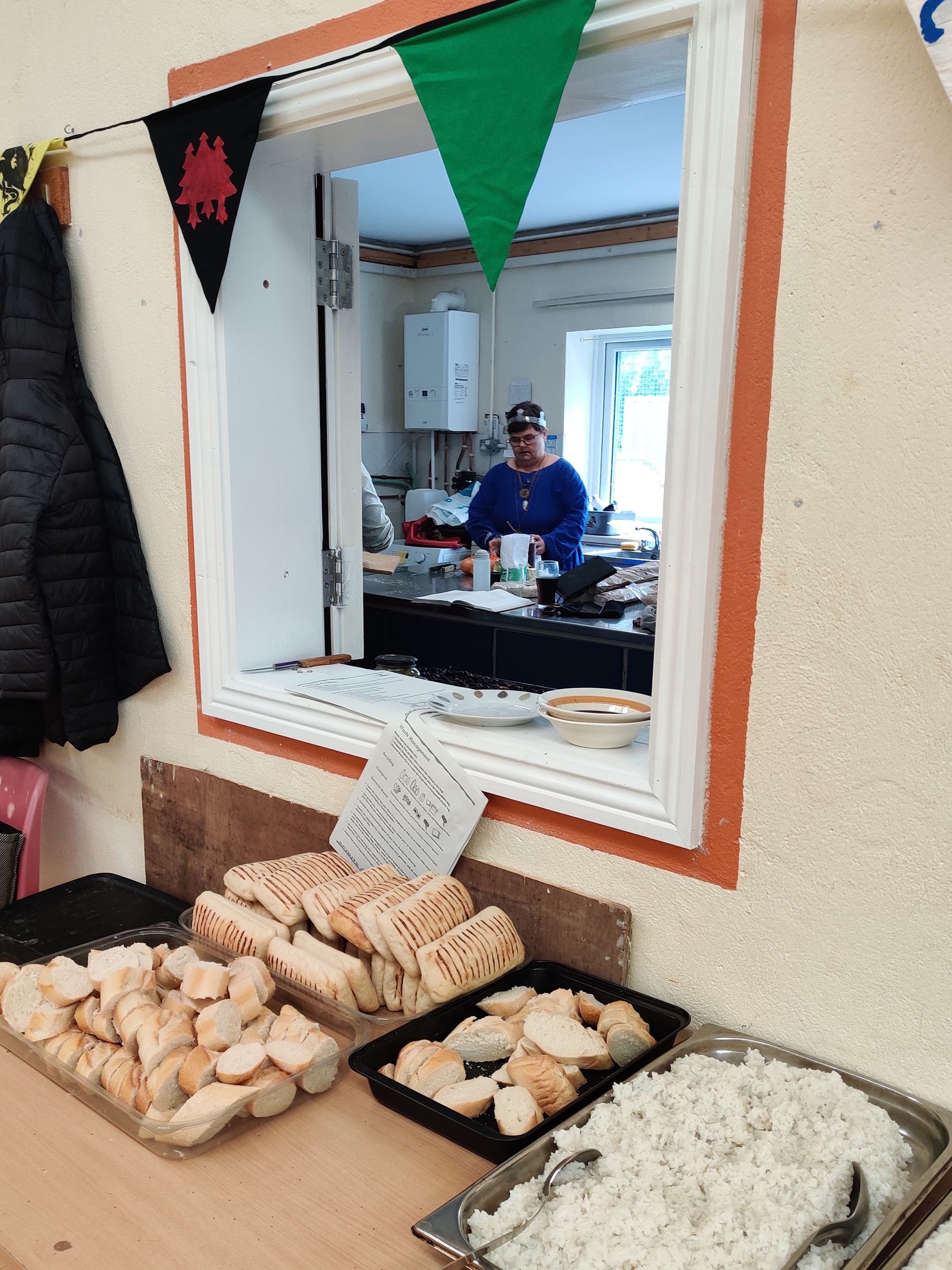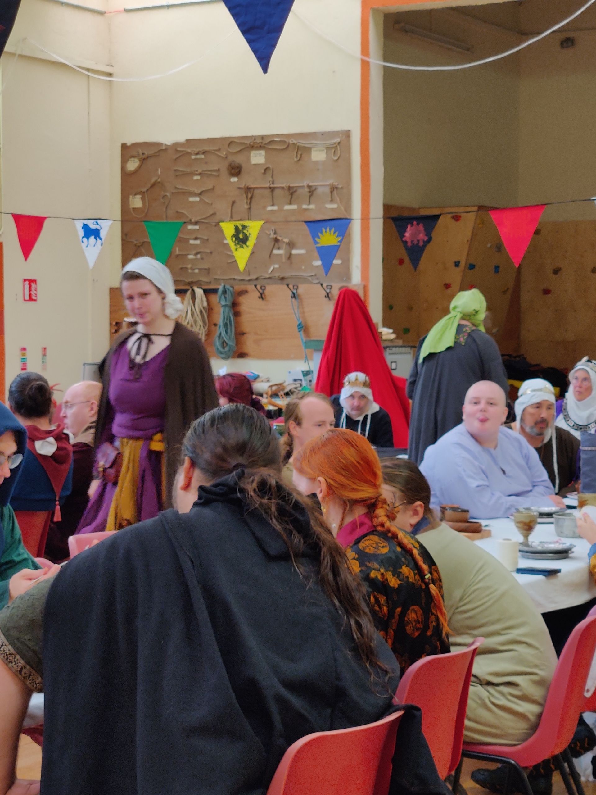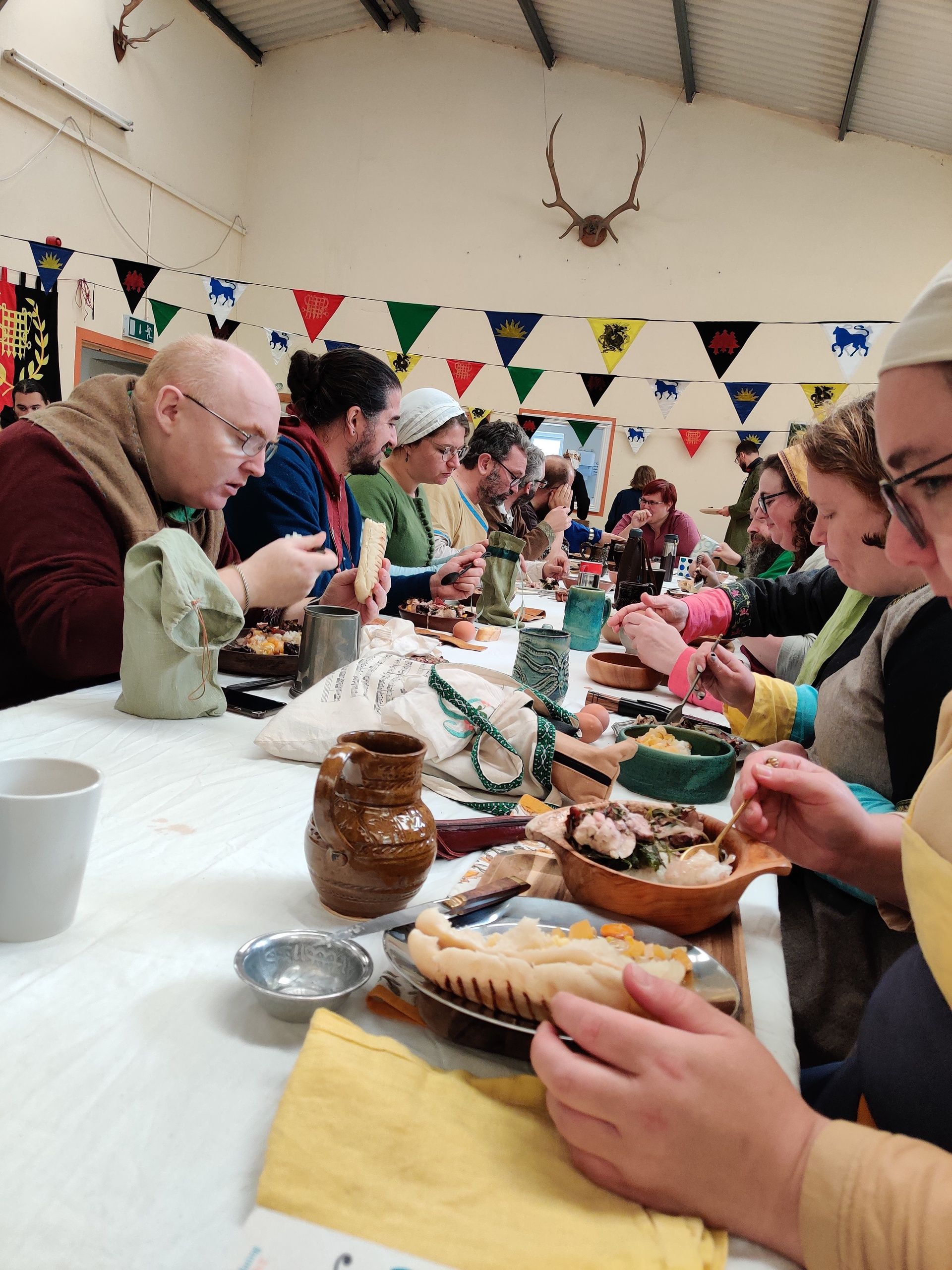 While the archers outside were honing their skills in bringing in the food, our wonderful cooks led by Máistir Aodh Ó Siadhail actually brought food, nay, a feast to the table. In the words of the master himself: